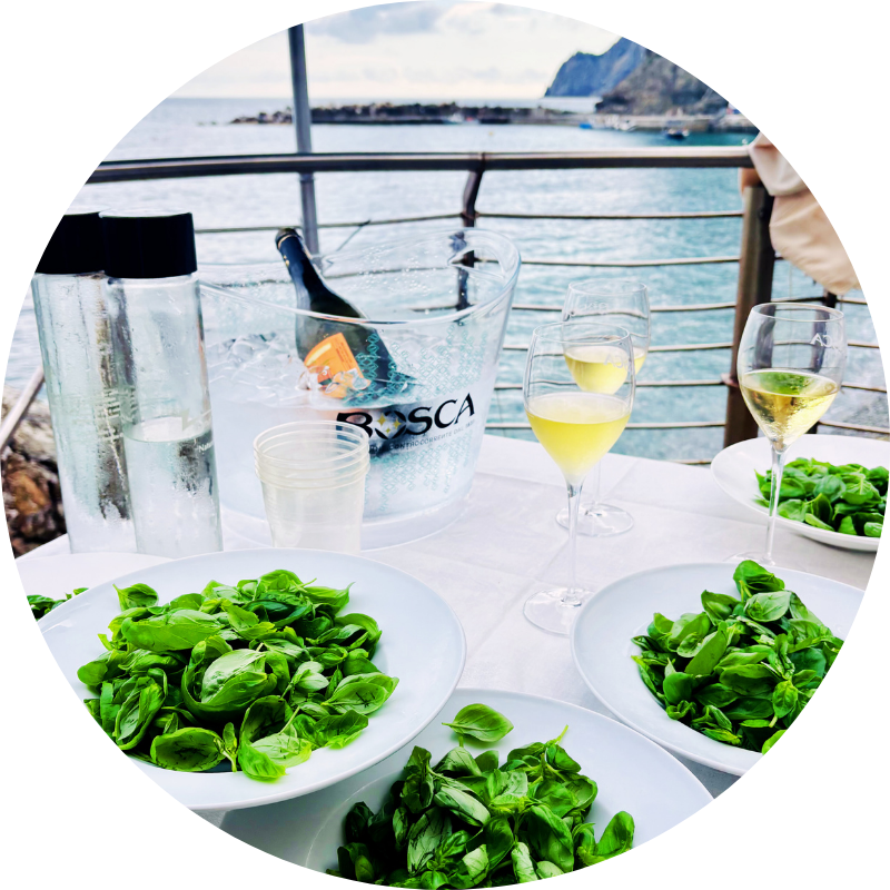 As the day winds down, we’ll head to a local beach club for a hands-on pesto class in a truly unforgettable setting. With the sound of the waves nearby, you’ll learn to prepare authentic Ligurian pesto the traditional way, paired with dinner and local wine. As the sky shifts into golden hues over the water, we’ll gather around the table, sharing stories, laughter and the simple joy of being in Italy together.